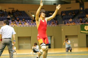 その言葉通り、決勝は緊張感のある激戦が続いた。まず55kg級の中野裕仁が2−1で粘り勝ちし、前日まで不調かと思われた74kgの高谷惣亮が本来の調子を取り戻して早大スーパールーキーの北村公平にフォール勝ち。チームスコア2−2となった時には、チームの熱気は最高潮に(左写真=高谷がチームスコアを五分に戻したが…)。