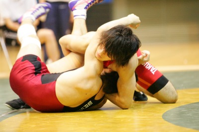 【55kg級】 中野裕仁(拓大=赤) ○[2−1(0-2=2:30,3-0=2:30,2-1) ]● 柏木健太(早大) 《試合経過》第1ピリオドはクリンチ。優先権は拓大・中野に出て、持ち上げて水車落としに移行するが、早大・柏木がこらえて0点に切り抜け30秒が経過。守った柏木に1点が入る。第2ピリオドもクリンチ。今度は柏木が優先権を取るが、中野が返して2点。第3ピリオドはラスト30秒、柏木がタックルからの1点を決めるが、中野はがぶり返しを決め、ラスト10秒で2−1と逆転した。 |