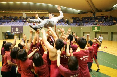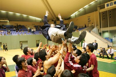 | 観客席のOBにあいさつする早大選手。 | 伊江邦男監督の胴上げ。 |