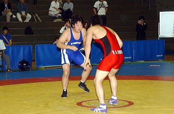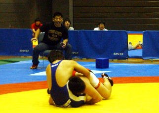 今春、3人の新人が入って部員が6人に増えた。「やっと練習らしくなりました。楽しいです」。部員は体育寮に住んでいる。自らはその近くに住み、授業後の練習のみならず朝練習から指導している。4月のJOC杯ジュニアオリンピックでは、森本慧伍(1年=三重・久居高卒)がグレコローマン96kg級の3位に入賞。上昇ムードができ、チームを引っ張るやりがいを肌で感じ始めたようだ(左写真=リーグ戦で闘う森本)。