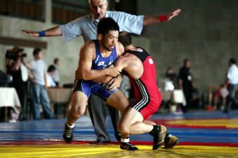 指導理念は「楽しくレスリングをやること」。ともすると誤解される言葉だが、決して「遊び感覚で」という意味ではない。笹本、松本、湯元といった五輪選手を間近に見ているだけに、強くなる秘訣が猛練習にあることは、だれよりも肌で感じている。「あの練習を見たら…。安易に『オリンピックを目指す』とは言えませんでした。それをやっていた小島先輩であっても五輪には行けなかったのですから」。(右写真:2007年7月、笹本、松本とともに遠征したグルジアの国際大会で闘う藤山コーチ=撮影・保高幸子)