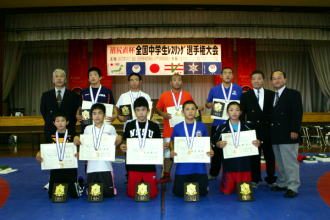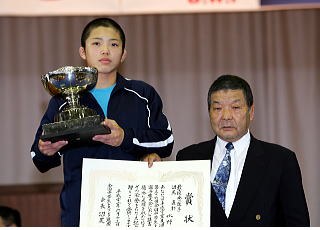 沼尻直杯全国中学生選手権最終日は6月13日、茨城県水戸市の茨城県立スポーツセンターで、男女各階級の敗者復活戦と決勝が行われ、男子59s級の水野真斗(京都・網野)が2年連続で優勝。最優秀選手賞となる沼尻直杯を受賞した(右写真)。