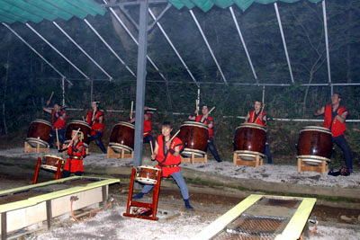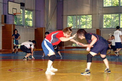 | 束の間の休けい。浜口京子選手が音頭をとってワッハッハッ節。苦しい練習を笑いで盛り上げる! | 練習もあと数種類。最後の力を振り絞ってメニューをこなす選手だち。 |