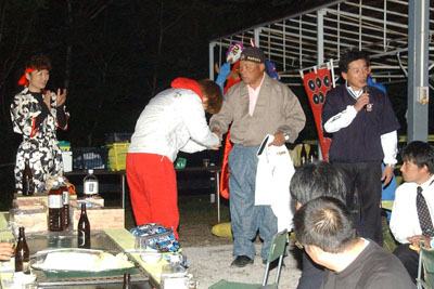 | バーベキューは公開練習に訪れた報道陣(右側)も参加。大相撲の賭博問題取材のため、参加をやめた社が5社あって残念。 | レスリング・チームを20年以上お世話にしている菅平プリンスホテルの大久保寿広社長へ、全日本Tシャツの贈呈。 |