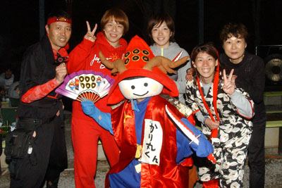 | この日の朝練習に参加したスピードスケートの小平奈緒さんと結城匡啓コーチも参加。あいさつする。 | 小平奈緒さん(中央)を囲み、忍者姿の吉田沙保里選手、浜口京子選手、歓迎会を盛り上げた人たちがポーズ。 |