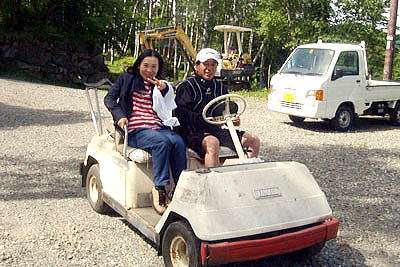| 朝練習の開始。写真右上が菅平ダボスで、そこまでの崖(冬はスキー場のゲレンデ)を選手は一気に賭け登る! | 菅平ダボスまでの道のりを、歩いても難しい(?)2人はカートで登山。日本協会の高田裕司専務理事と武田明子事務局員。 |