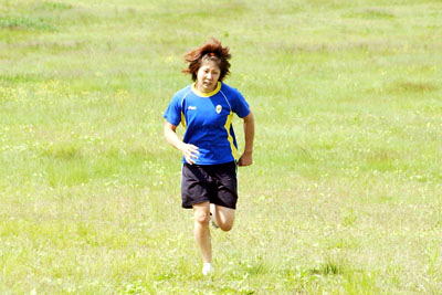 | 900メートル走をいつもトップで走るのは岩群安奈選手(至学館大)。高校時代には駅伝に駆り出されたとか。 | 900メートル走3セット(前日は5セット)のあとは、坂道ダッシュ。心肺機能の強化には最適の場所。 |