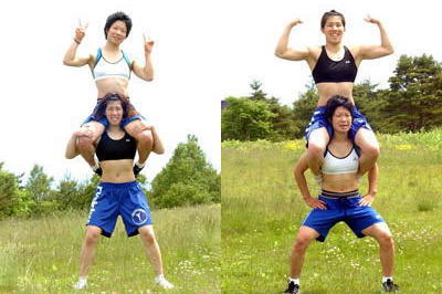 | 苦しい中でも笑顔を絶やさない甲斐友梨選手と吉田沙保里選手。カメラを向けるとポーズ!この余裕が強さの秘密? | 練習終了! やっと360度の見晴らしが目に入る!? |