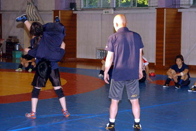 | 2面マットでゴールデンGP決勝大会、世界ジュニア選手権、スポーツ・コンバット・アコード、世界選手権へ向けての練習。 | 栄和人・女子強化委員長の技術指導。 |