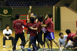 ――全日本学生王座決定戦の存在価値が薄れていますが? 国体が夏秋同時開催となって9月終盤から10月初めの開催になった。過密日程の中で、9月下旬にこの大会を開催する意味があるのでしょうか。西日本からの参加も少なく、東日本リーグ戦の二番煎じの大会ともなっている(右写真=昨年の全日本学生王座決定戦で優勝し、喜ぶ早大選手)。