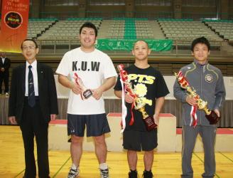 55s級は地元の尾形翼(山形ク)が決勝でも豪快なリフト技を決めてフォール勝ち。会場を大いに沸かせて、優秀選手賞に選出された。敢闘賞は120kg級優勝の曽我部健(日亜化学工業)。(右写真=左から日本社会人連盟の村上功副会長、曽我部、倉本、尾形)。