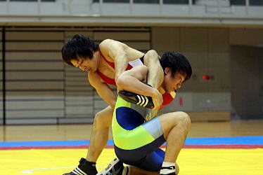 ジュニア、シニアと年齢区分を問わずレベルが高いフリースタイル55s級の決勝戦は、守田泰弘(山口県協会)−猪股大志(宮崎県協会)の顔合わせとなった。いずれも、昨年まで日体大の学生で、レギュラーを争った間柄だ(右写真:決勝で闘う守田=青=と猪股)。