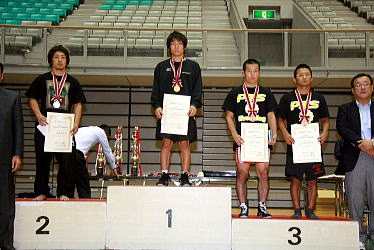 猪股も、昨年の後半は棒に振ってしまったこともあり、「もう少しレスリングを続けたい」と、アルバイト生活で日体大に残って練習を積んでいる。「今年1年やって、ダメなら就職などを考える」と、今年にかける気持ちは強い。今回も守田に負けたものの、第1ピリオドの後半には豪快な3点タックルを決め、一矢報いることはできた。(左写真=表彰式)