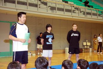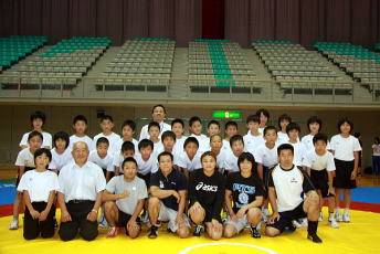 指導者に、自衛隊の伊藤広道監督、2004年アテネ・2008年北京五輪金の伊調馨(ALSOK綜合警備保障)、世界V6の坂本日登美(自衛隊)を迎え、レスリングの紹介とマット運動を中心に行った(右写真=左から伊藤、坂本、伊調)。