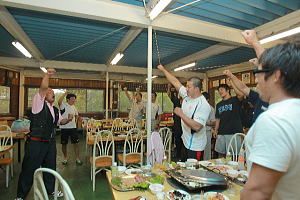 練習の後はバーベキュー会が行われ、毎年お世話になる菅平プリンスホテルの大久保社長も加わり、楽しい時間を過ごした。これは、厳しいトレーニングの中で選手たちの息抜きという意味も考えられている。