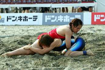 59kg級の齊藤貴子(右写真)。拓大まで柔道をやっていた。当時からレスリングにも関心があり、レスリング部の朝練習に参加させてもらったこともある。4年生の時にビーチレスリングに出場して優勝(左下写真=赤が齊藤。相手はプロ格闘家の藤井恵選手)。当時の自衛隊の宮原厚次監督の目にとまり、声をかけてもらったのがきっかけでレスリングの道へ。1年間の集合教育を経て、2007年4月にレスリング班に入ることができた。