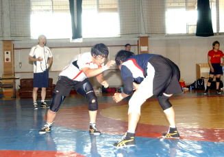 こうした経験をもとに、クリッパン女子国際大会よりランクの上のゴールデンGP決勝大会に挑む。「横に動きながらフェイントを使っての攻撃」や「タックルに入ったあと、返されない身のこなし」などが課題。また、クリッパンの決勝で敗れた2005年世界2位のマリアンナ・サスティン(ハンガリー)ら出場が予想される選手のビデオテープを見て、研究を積んでいる(左写真=全日本合宿での齊藤)。