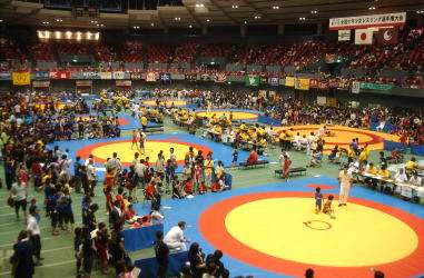 | 大会を支えた広島県レスリング協会ほかの役員たち | 8面マットで試合をさばいた審判員 |