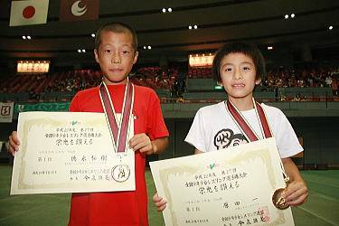 昨年、広島勢は優勝なしの成績だったが、1年前に広島大会開催が決定すると、地元開催を盛り上げようと、強化を開始。その結果が実って、3年男子22kg級の原田一(広島ク=右写真の右)と、5年男子30kg級の徳永弘樹(東広島ジュニアスポーツ少年団=同左)の2名が金メダルを獲得した。両チームともに、同じ「広島」の看板を背負って、1年間協力し合って強化してきたことが相乗効果を生んだのだろう。