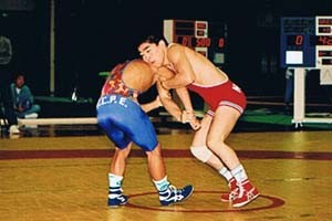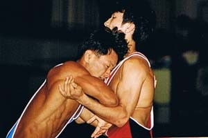 | 1993年アジア選手権で銀メダルを獲得した広島クラブの向井孝博監督。 | 1993年全日本大学グレコローマン選手権決勝で闘う広島クラブの山根進コーチ。 | 1991年全日本学生選手権決勝で、1年後に五輪代表になった花原大介を破った東広島の深水真司監督。 |