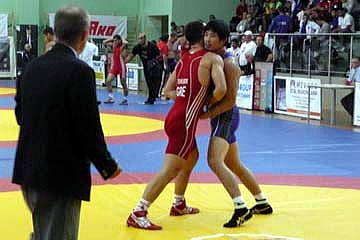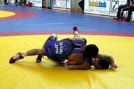 斎川は初戦で2008年北京五輪96kg級代表のセオドロス・トウノウシディス(ギリシャ)と対戦し、1−2で黒星(右写真)。第3ピリオド、相手を場外に押し出してリードを取ったものの、ラスト30秒のグラウンドの攻撃をリバース・ウェスト・ロックの組み手でスタートし、インサイド・リバースと胴タックルで返され逆転された。敗者復活戦へは回れなかった。