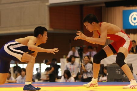 | 【74kg級】 坂本悠太(霞ヶ浦=赤)○[2−0(1-0=2:09,4-2)]●殿村和城(秋田商) 坂本が粘り、霞ヶ浦2−3と追い上げる。 |