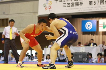 | 【50kg級】 佐々木峻介(秋田商=青)○[2−1(5-2,2B-2,3-0=2:05)]●小宮佑介(霞ヶ浦) 2007年以来の決勝で対戦となった両チーム。“先鋒”は秋田商が勝つ。 |