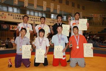 唯一、春のリベンジを達成したのは60s級センバツ2位の桑原諒(静岡・飛龍)で、センバツ王者の鴨居正和(香川・香川中央)を2−0(両ピリオドともにクリンチ)で下した(右写真=優勝者。前列左から後列右へかけて、軽量級〜重量級の順)。