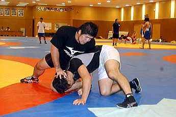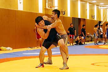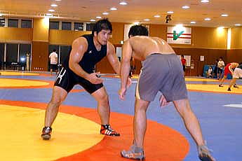 日本協会の福田会長の仲介もあって、この日からの合宿に急きょ参加。「前日、買ったばかり」というレスリング・シューズに足を通し、アテネ五輪の“メダル仲間”の田南部力コーチ(警視庁)の指導で技の研究やスパーリングをした(右写真=タックルで脚を取られながらも粘る泉)。
