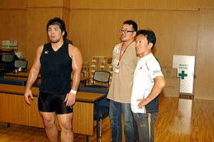 | 田南部力コーチの技術指導 | 泉選手を指導する安生洋二コーチ(中央)、佐藤満強化委員長(専大教)と学生選手の練習を見学。 | フリー894kg級全日本王者の松本真也(赤)との手合わせはなかったが、技術指導を受けた。 |