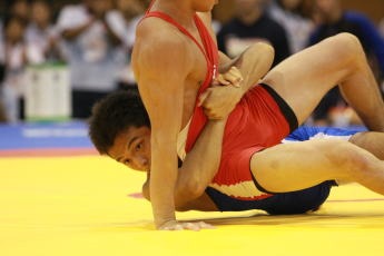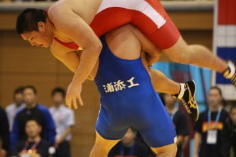 沖縄には、屋比久監督をはじめ、八重山の具志堅太一監督(日体大卒)などレスリング経験のある顧問が10名ほどいる。具志堅監督が「練習相手がいないから、先生たちは自分の持っている技をすべて教えます。選手は、その中から自分にあった技を使うようになる」と話すように、学校の壁を超えて指導をしてきた(左写真=120kg級の志喜屋は、前川勝利をタックルから持ち上げてポイントを奪った)。