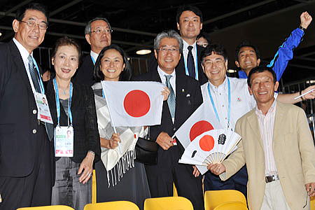 JOCの竹田恆和会長(中央)ほか大会役員も祝福。