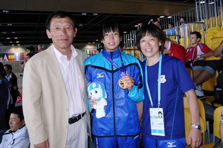 宮原を囲み、吉村祥子監督(右)と菅芳松・事務局次長。
