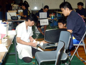 高校生の試合で一番多いけがは鼻血。脱きゅうも珍しくなく、初日だけで3件あったという。ねん挫も多いようだが、「ねん挫くらいでは、診断を受けに来ないことが多いですね」と言う。また室内スポーツでエアコンは効いているとはいえ、減量があるので熱射病の危険も高い。開会式でも1人が倒れた。「十分に注意してほしいですね」と警鐘を発する(左写真=けがした選手を手当てする川原さん)。