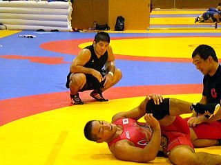 同選手は、総合格闘家としての成長を目指し、レスリングで2012年ロンドン五輪出場を目指すことを決意。今月10日には同所で行われた専大・警視庁・神奈川大の合宿に加わり、レスリング選手としての活動をスタート。今回はよりハイレベルの全日本合宿に参加。フリースタイル84kg級・前全日本王者の松本真也(警視庁)ら全日本トップ級の選手と手合わせした(左写真:松本=手前と泉選手)。