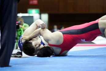 「恩返しができた」と、この優勝を謙虚に受け止めながら、これでつながった次の目標、世界選手権に照準を合わせ、レスリングを続けることになった。迎えた5月の全日本選抜選手権。ここで優勝すれば世界選手権代表に決定するという決戦の場。勝つことへの執念は下中が荒木田を上回った。リベンジに燃える前王者にそり投げを決めての優勝は見事だった(右写真=赤が下中)。