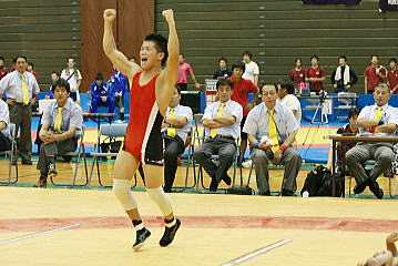 梶は「一真さんにグレコは教えてもらいました。組み手やリフトもうまくて、一真さんのようなレスリングがやりたくなったんです」とグレコローマンに没頭し始めた。得意技は、スタンドからの攻撃だった。スタンドでは、フリースタイルの全日本トップ選手からもポイントを奪えるほど。そのスタイルから、現在は「グラウンドのリフト技」が梶の十八番だ(右写真=優勝を決め。ガッツポーズの梶)。
