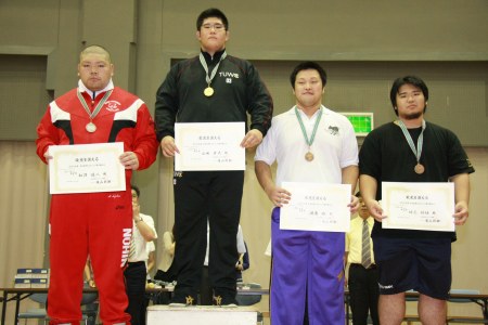 【120kg級表彰式】 (左から)2位=相沢優人(日大)、優勝=谷田昇大(拓大) 3位=渡邊駿(明大)、坂元将悟(東洋大) |