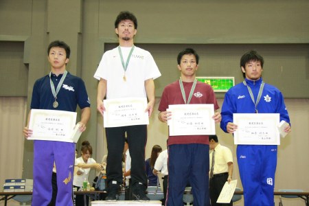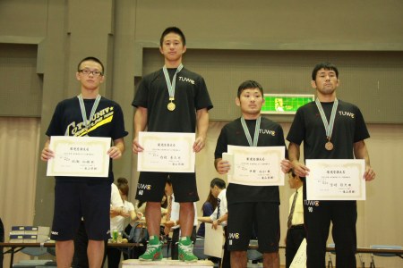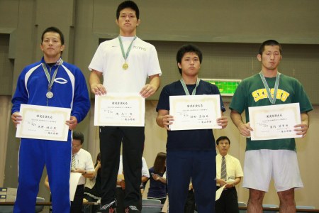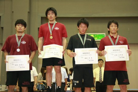 【74kg級表彰式】 (左から)2位=田村和男(早大)、優勝=武富隆(早大) 3位=福田翼(拓大)、北村公平(早大) |
