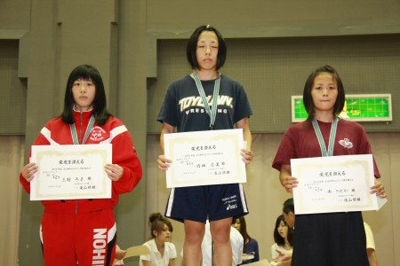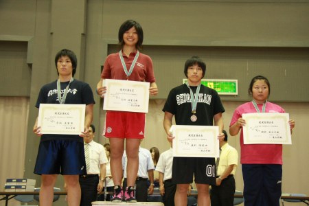 【48kg級表彰式】 (左から)2位=三村冬子(日大)、優勝=内田奈美(東洋大) 3位=西のどか(早大) ※長沼美香(至学館大)は負傷欠席 |