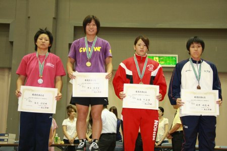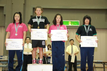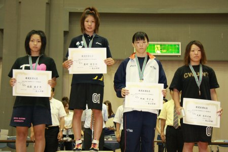 【67kg級表彰式】 (左から)2位=吉元清香(環太平洋大)、優勝=井上佳子(至学館大) 3位=飯島千晶(日大)、新井明恵(法大) |