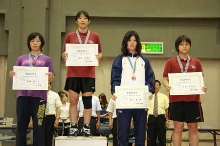 【51kg級表彰式】 (左から)2位=佐藤亜子(大東大)、優勝=岩群安奈(至学館大) 3位=平田幸子(法大)、矢野恵利佳(至学館大) |