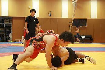 「2008年は負けが込んでいましたが、その後、自分でも強くなったと思います」という小田。もう15年以上にもなるレスリング人生。「だからロンドン五輪以降は続けるつもりがないんです」と、2012年ロンドン五輪を自分のレスリング人生の集大成に設定している。「ロンドンでやり切りたい。絶対に金メダルを取らなければ」と言う(左写真=小田の練習を佐藤満強化委員長が見つめる)。