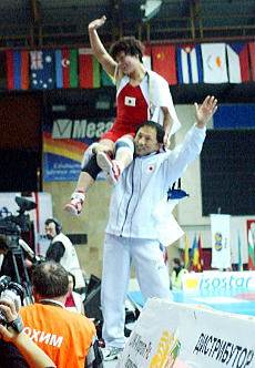 坂本は2001年に世界V2を達成し(左写真)、国際レスリング連盟(FILA)のベストレスラーに選出され、女子レスリング界では、ナンバーワンの存在だった。しかし、その直後にFILAが五輪実施階級と決めたのは、51kg級ではなく48kg級。当時高校生だった真喜子の方が先に注目されてしまった。