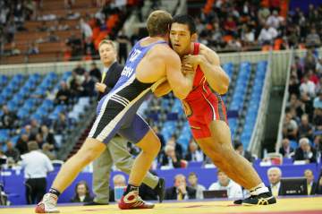昨年8位だった男子グレコローマン66kg級の藤村義(自衛隊)の2度目の世界挑戦は、初戦敗退に終わった。しかし、ウラジミール・ポグディン(ウズベキスタン)相手に組み手を攻勢に終始積極的に攻め、優位を保っていた(右写真)。