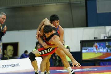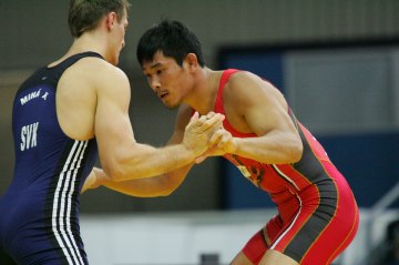 アジア選手権銀メダルの実績を持って2度目の世界選手権に臨んだ男子グレコローマン84kg級の斎川哲克(両毛ヤクルト販売)は、初戦を快勝したものの(右写真)、2回戦で6月の「G・カルトジア&V・バラバーゼ国際大会」(グルジア)で優勝しているウラジーミル・ゲゲシーゼ(グルジア)に0−2で敗れた。