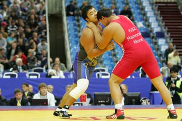 相手はムラト・ラモノフ(キルギスタン)。試合運びは悪くなかった。第1・2ピリオドともに「チャンスがあれば、と思って、狙ってやった」というように、組み手で攻め続け、スタンド戦は五分五分だった(左写真=スタンド戦で互角に闘った新庄)。