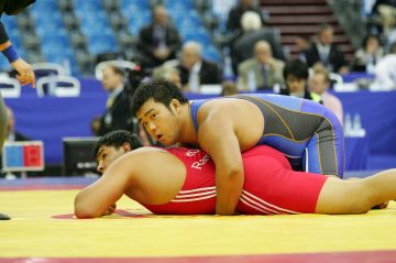 世界への対策としてガッツレンチを自分の技として身につけ、十分な経験を経て入賞を目標に臨んだ男子グレコ−ロマン120kg級の新庄寛和(自衛隊)の3度目の世界選手権。だが、その挑戦は初戦でついえた。