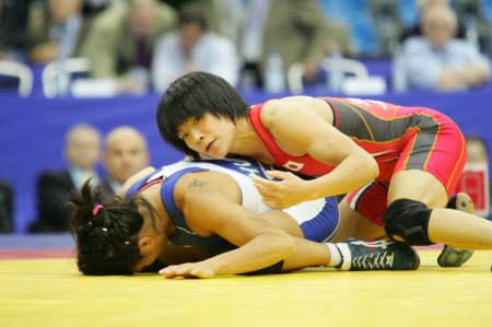 | 48kg級としての世界第1戦、坂本は積極的に攻めた。 | ニアフォールの連続の後、最後はフォール。 |