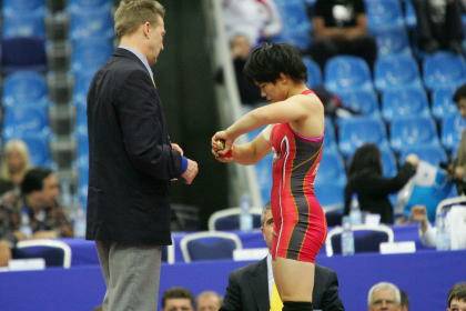 女子51kg級の決勝、堀内優−オレクサンドラ・コート(ウクライナ)戦は、第1・2ピリオドとも0−0。第1ピリオドは赤の堀内が青を引いてしまい(右写真)、相手の攻撃権へ。第2ピリオドは青のコートが引いて、自らの青が出て攻撃権を獲得した。